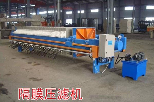隔膜壓濾機(jī),隔膜壓榨壓濾機(jī)由隔膜板和廂式濾板排列組成濾室,在輸料泵的壓力作用下將漿料輸入濾室,通過過濾介質(zhì)(濾布)將濾料中的固體和液體分離,當(dāng)漿料中的固體形成餅后,再向隔膜通入空氣,對濾室內(nèi)的固體充分壓榨,降低含水率。對于粘性物料的過濾及對含水率要求較高的用戶,此機(jī)更有其獨(dú)特的特性。
